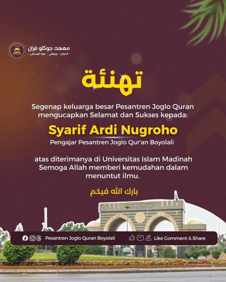 Pondok Pesantren Joglo Qur’an Boyolali kembali meraih kebanggaan dengan prestasi luar biasa dari salah satu pengajarnya. Segenap keluarga besar Pondok Pesantren Joglo Qur’an dengan penuh rasa syukur mengucapkan selamat dan sukses kepada Syarif Ardi Nugroho, salah satu pengajar berprestasi di pondok, atas diterimanya beliau di Universitas Islam Madinah.